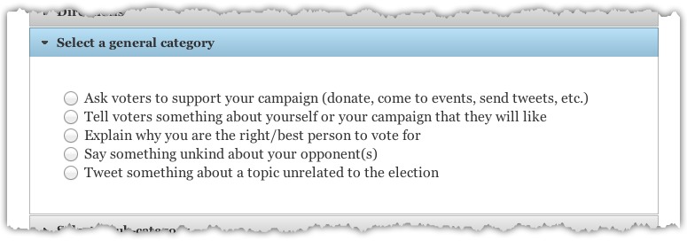 Since the application doesn’t know the specifics of your race, the list of general categories is not focused on your issues. Instead, the categories are focused on what you hope to achieve by your tweet — what thing you most need now to advance your campaign.